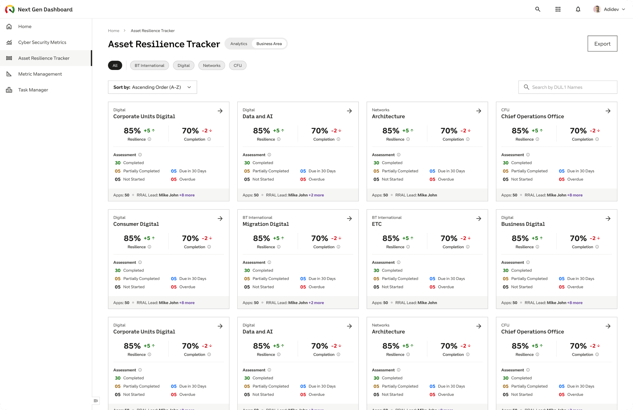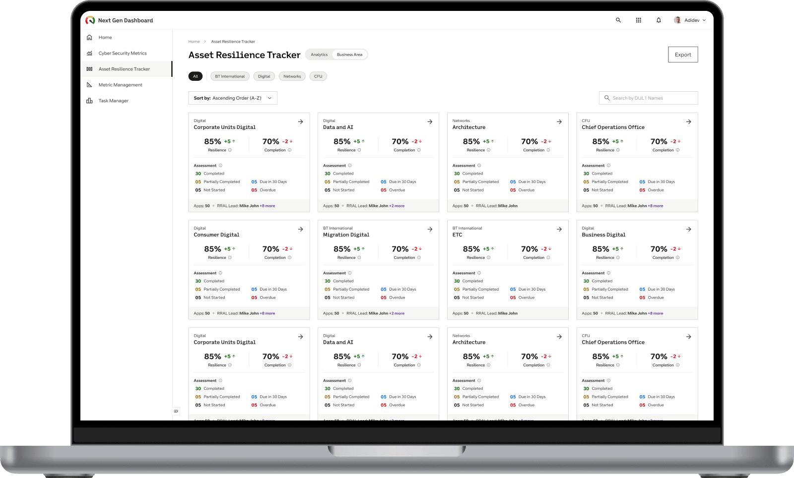 To reduce spreadsheet fatigue issues in British Telecom, I designed the Asset Resilience Tracker, which takes scattered compliance information and converts it into one place where the information is presented in an easy-to-understand manner via an actionable health check. The system has also moved Governance Leads away from manual reporting and into a proactive system whereby they are able to manage issues through a drill-down tool linkages that provide a direct link from high-level information to actions.