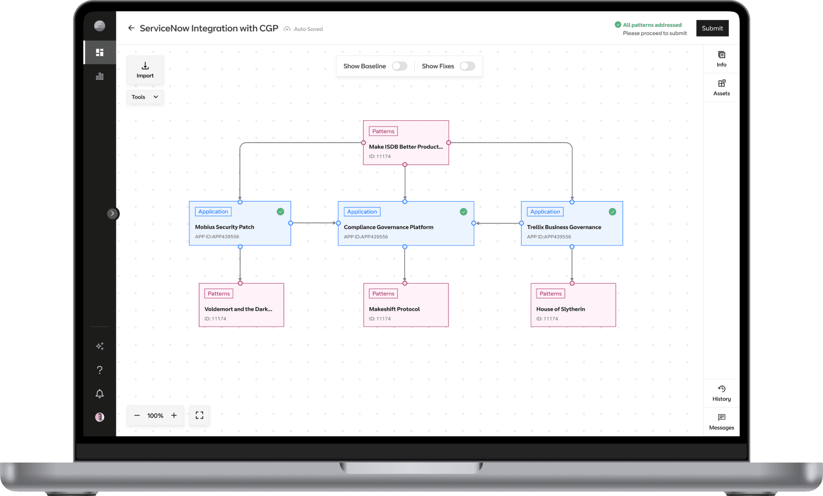 When an architect clicks the side panel open, they get a clear view of the security controls in which they are deficient ("Baseline Patterns"). By one click of confidence, the system implements the approved fix, turning a difficult procedure into a simple operation, represented by a green checkmark.