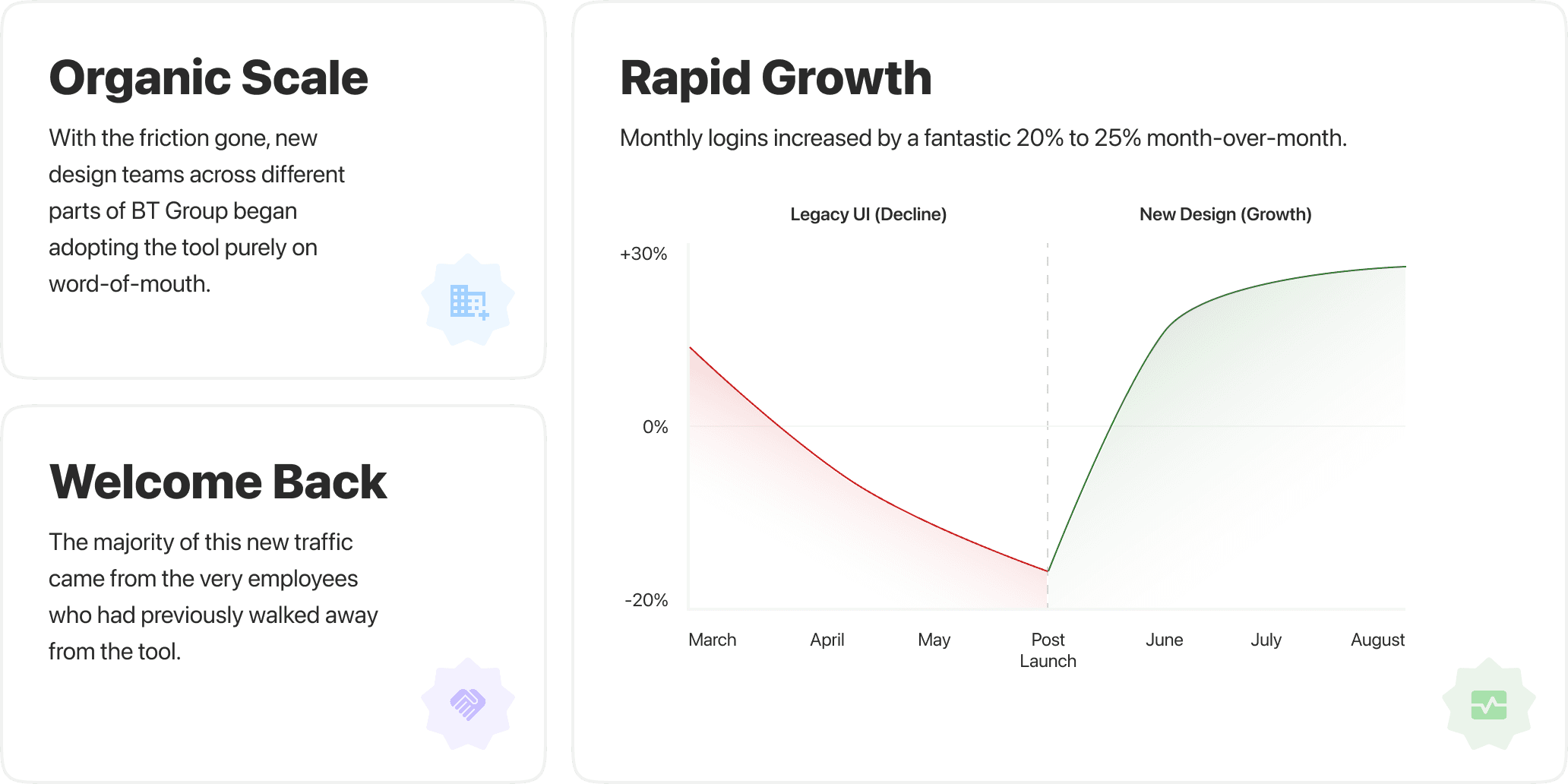 Crafting the internal BT Group’s design compliance engine, turning a 10-15% decrease in users per month into a 20-25% MoM gain. Through the shift in the overall product approach from policing to design help, I upgraded a sophisticated audit solution into a user-friendly copilot that performs data entry automatically.