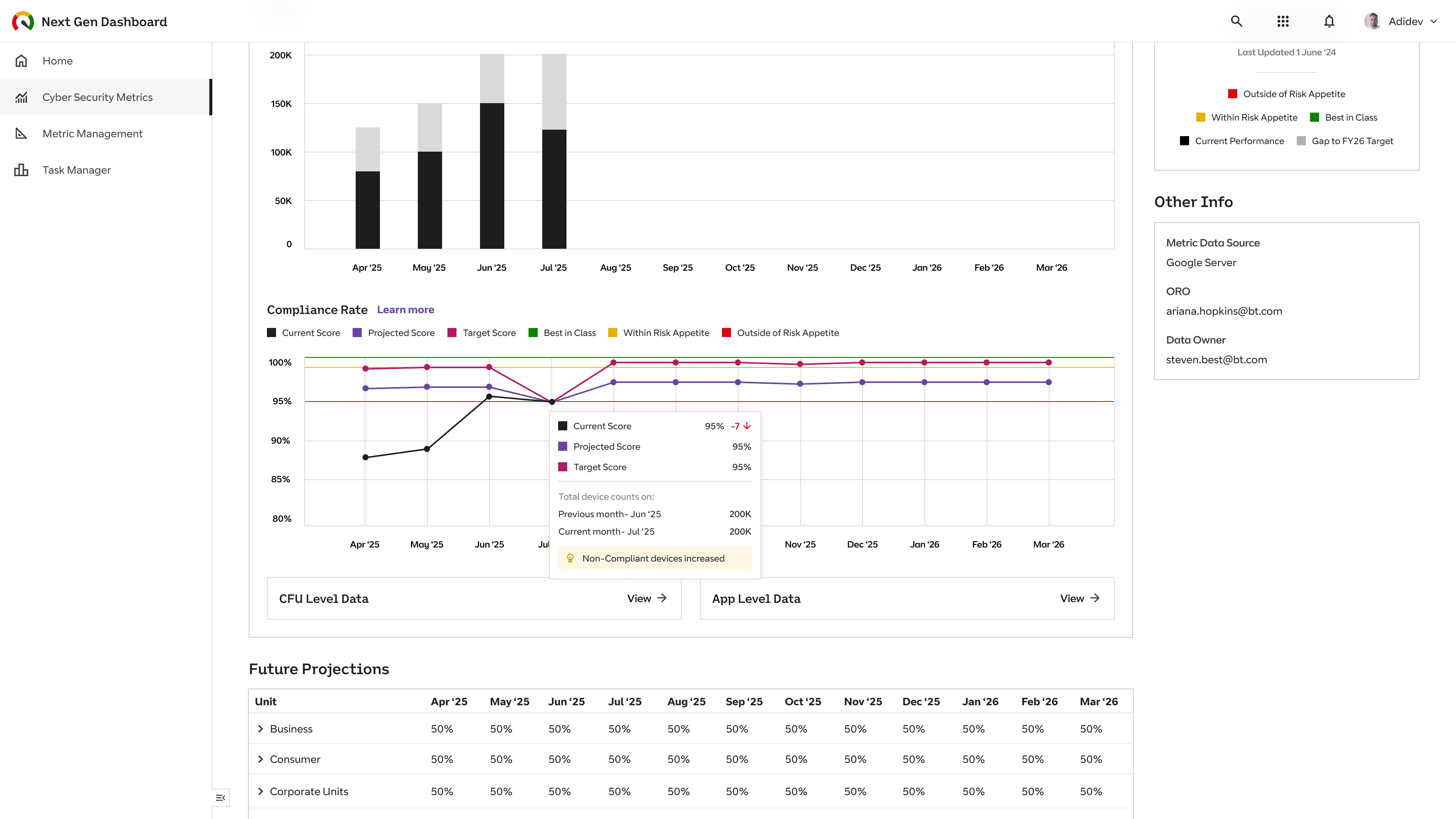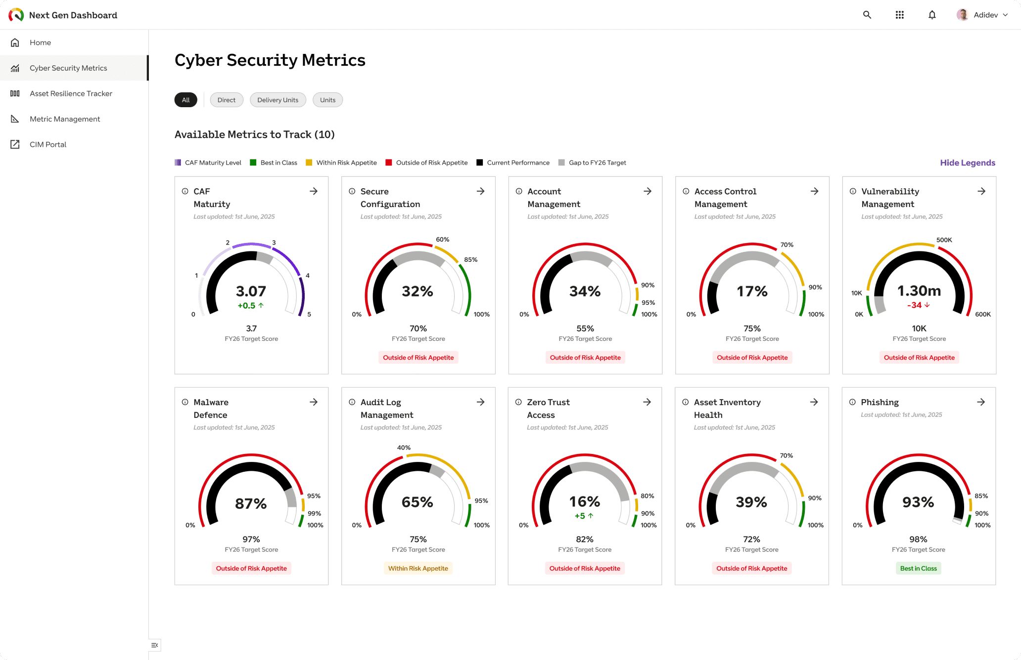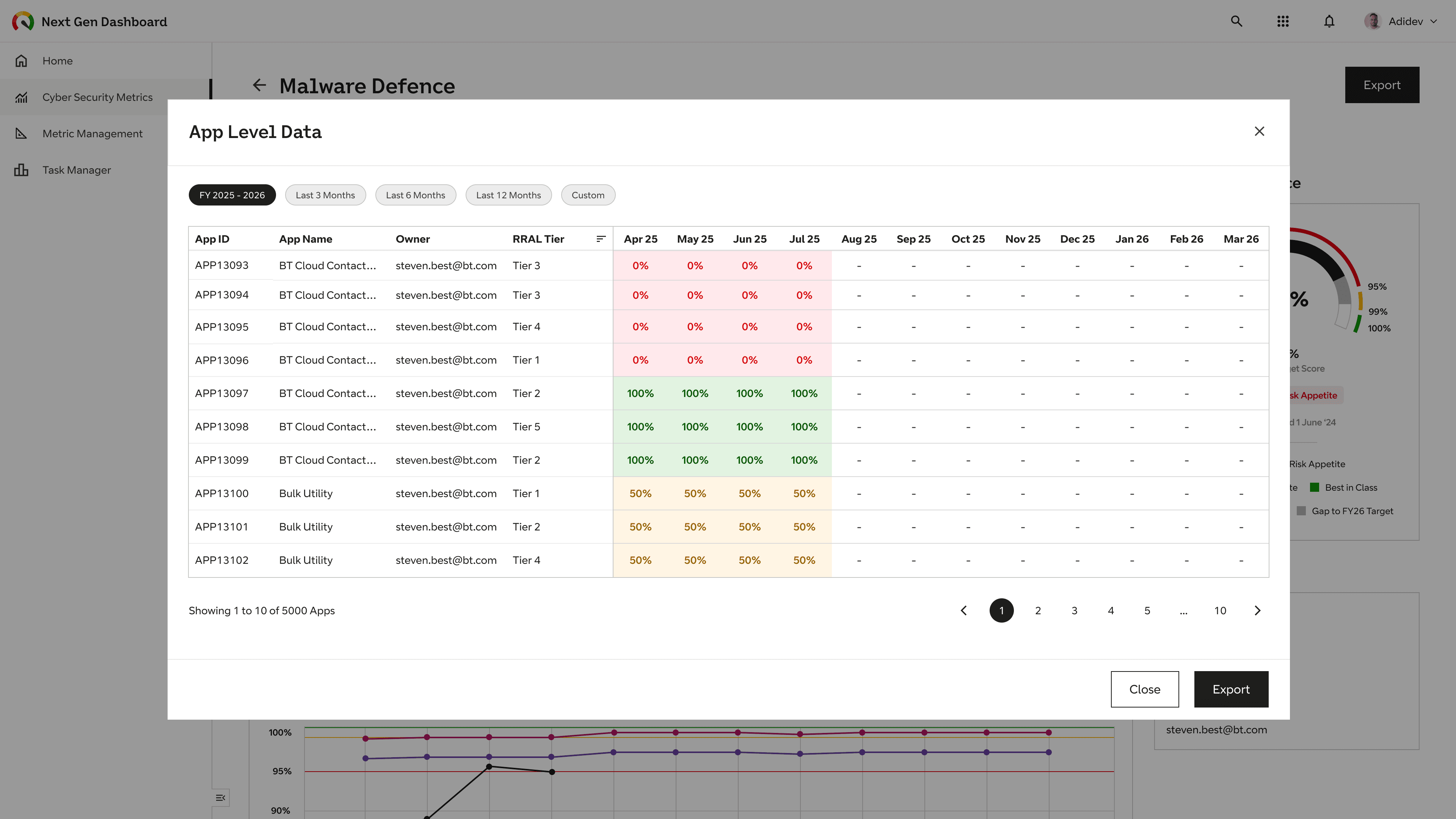 To add value from the outset, we concentrated the first build on a shortlist of 10 key Cyber Security metrics (Malware Defence, Phishing, etc.). The leadership landing page was built to be self-explanatory, using a strict Red Amber Green system to enable leaders to assess Risk Appetite in an instant.
